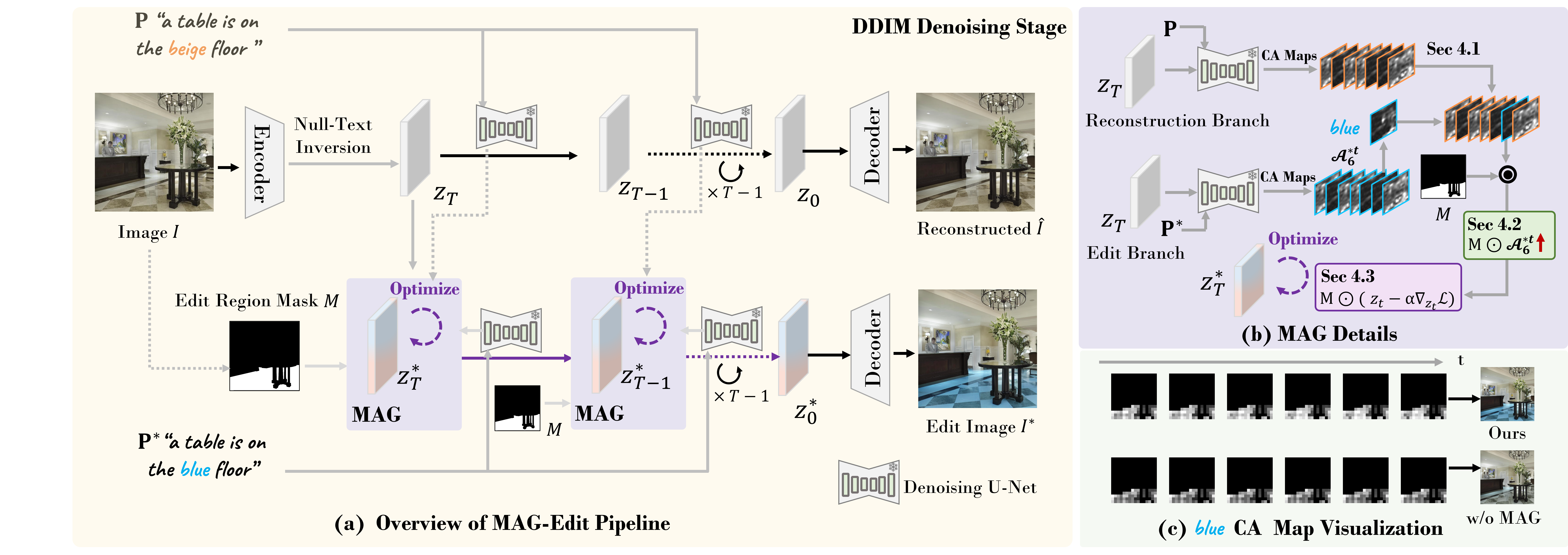 Together with Yuchao Gu and Mike Zheng Shou, we develop MAG-Edit :the first method specifically designed to address localized image editing in complex scenarios without training.Recent diffusion-based image editing approaches have exhibited impressive editing capabilities in images with simple compositions. However, localized editing in complex scenarios has not been well-studied in the literature, despite its growing real-world demands. Existing mask-based inpainting methods fall short of retaining the underlying structure within the edit region. Meanwhile, mask-free attention-based methods often exhibit editing leakage and misalignment in more complex compositions. In this work, we develop MAG-Edit, a training-free, inference-stage optimization method, which enables localized image editing in complex scenarios. In particular, MAG-Edit optimizes the noise latent feature in diffusion models by maximizing two mask-based cross-attention constraints of the edit token, which in turn gradually enhances the local alignment with the desired prompt. Extensive quantitative and qualitative experiments demonstrate the effectiveness of our method in achieving both text alignment and structure preservation for localized editing within complex scenarios.[Paper][Code][Page]